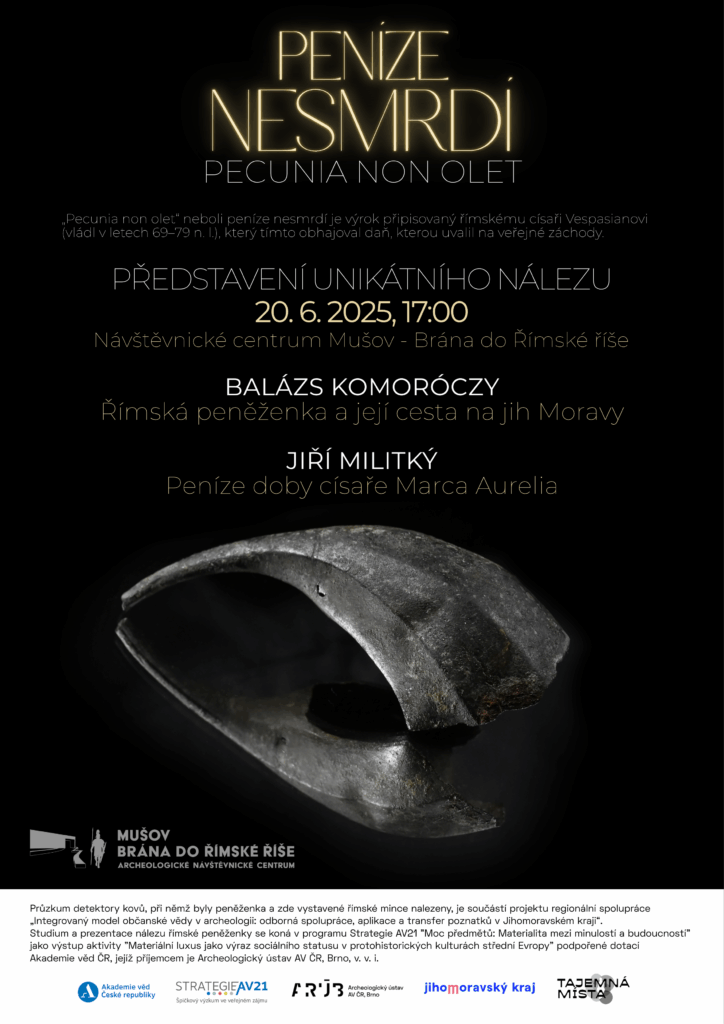 Archeologický ústav AV ČR, Brno vás srdečně zve do Návštěvnického centra Mušov – Brána do Římské říše na představení unikátního nálezu římské peněženky: PENÍZE NESMRDÍ (Pecunia non olet) – je výrok připisovaný římskému císaři Vespasianovi (vládl v letech 69–79 n. l.), který tímto obhajoval daň, kterou uvalil na veřejné záchody. Termín konání: 20. 6. 2025, od 17:00 hod.Místo: Návštěvnické centrum Mušov – Brána do Římské říšeVstupné: běžné vstupné Římská náramková peněženkaMísto nálezu: Římská pevnost Hradisko u MušovaNálezce: Roman Šteffel, Archeologický ústav AV ČR, BrnoDatum objevu: leden 2025Materiál: slitina mědiStáří: cca 1 845 let Tento pozoruhodný nález – první svého druhu nejen na našem území, ale pravděpodobně i severně od hranic Římské říše – nás zavede do doby markomanských válek, kdy se na jižní Moravě zdržovalo římské vojsko císaře Marka Aurelia. Fragment bronzové náramkové peněženky, nošené na předloktí římským vojákem, nás nechává nahlédnout nejen do každodenního života římské armády, ale i do jejich finančních zvyklostí. Nález vzbuzuje mimořádný zájem odborné i laické veřejnosti a otevírá otázky po velikosti žoldu, šíři vojenské ekonomiky a přítomnosti římské centrální pokladny na našem území. Součástí akce bude přednáška Jiřího Militkého, unikátní nález představí Balázs Komoróczy. Anotace přednášek:BALÁZS KOMORÓCZY – Římská peněženka a její cesta na jih MoravyU nás unikátní objev fragmentu „římské peněženky“ podtrhuje význam archeologické lokality Hradisko u Mušova z hlediska poznání doby, kdy k nám pronikla mnohatisícová armáda římského císaře Marca Aurelia. Co je sem přivedlo, v jakých místech a v jaké podobě dnes archeologie objevuje jejich stopy? Jaké jsou vůbec hmotné pozůstatky římské okupace jižní části našeho území? Na tyto otázky odpověď hledají dlouhodobé výzkumy Archeologického ústavu AV ČR, Brno zejména na jihu Moravy. Jejich aktuální výsledky budou stručně představeny v přednášce B. Komoróczyho. JIŘÍ MILITKÝ – Peníze doby císaře Marca AureliaŘímská společnost je společností s plným využitím peněz v podobě mincí nejrůznějších hodnot a provedení. Uplatňují se v obchodních vztazích, v politice a hrají zásadní roli v podobě žoldu, nezbytného pro udržování mohutné armády představující základní mocenskou, správní, ekonomickou a společenskou sílu v Římské říši. Peníze, tedy mince se liší svou kvalitou i provedením v éře každého panovníka, přičemž období vlády císaře Marca Aurelia není výjimkou. V rámci přednášky J. Militkého budou představeny hlavní rysy římského peněžního systému a nastíněny typy mincí ražených v době, kdy na našem území operovala římská armáda. Průzkum detektory kovů, při němž byly peněženka a zde vystavené římské mince nalezeny, je součástí projektu regionální spolupráce „Integrovaný model občanské vědy v archeologii: odborná spolupráce, aplikace a transfer poznatků v Jihomoravském kraji“. Studium a prezentace nálezu římské peněženky se koná v programu Strategie AV21 „Moc předmětů: Materialita mezi minulostí a budoucností“ jako výstup aktivity „Materiální luxus jako výraz sociálního statusu v protohistorických kulturách střední Evropy“ podpořené dotací Akademie věd ČR, jejíž příjemcem je Archeologický ústav AV ČR, Brno, v. v. i. Akce je součástí projektu Tajemná místa Jihomoravského kraje.