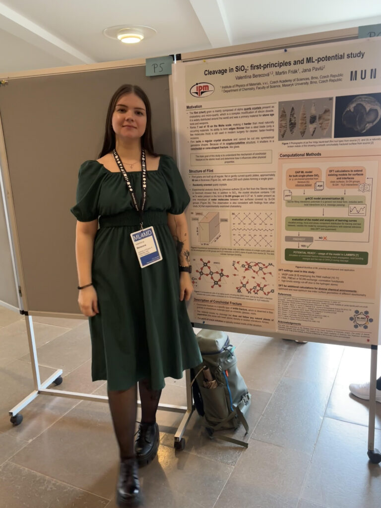 Doktorandka Valentína Berecová, pracující v Ústavu fyziky materiálů AV ČR v Brně, se podílí na teoretickém výzkumu v rámci Strategie AV 21 Moc předmětů – Materialita mezi minulostí a budoucností. Ve skupině Martina Friáka se věnuje výzkumu materiality antropogeneze, konkrétně teoretickému zkoumání materiálových aspektů lomové mechaniky pazourku SiO2na atomární úrovni. Vzhledem ke komplexnosti tohoto problému si rozšířila své znalosti a dovednosti v oblasti teoretického modelování na mezinárodním workshopu „Machine Learning for Material Design“ organizovaném na Aalto University, Espoo, Finland, 05.- 08. 05. 2025. Jednalo se o aktivní účast, kdy prezentovala poster s názvem „Cleavage in SiO2: first-principles and ML potential study“ s prvními výsledky bádání týkajícími se materiality antropogeneze a vlastností pazourku (SiO2).